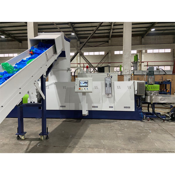Esta máquina de reciclaje de pellets de plástico es un granulador de plástico con sistema de corte de riego, aglomerador de plástico y extrusora de un solo tornillo de plástico.